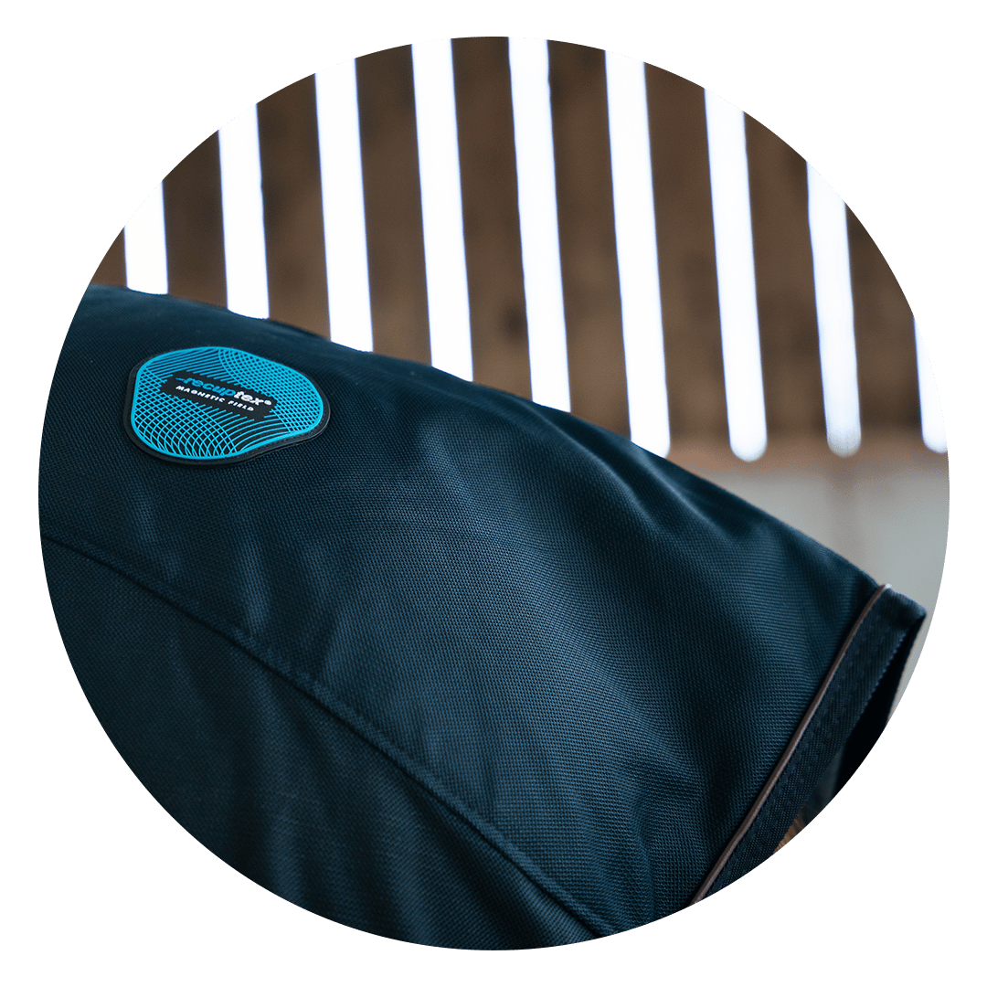 La couverture utilise un tissu appelé Recuptex qui est basé sur une technologie belge appelée BEKINOX®. Il contient des fibres d’acier inoxydable très fines qui sont tissées dans le tissu, créant une cage de Faraday (espace qui ne laisse passer aucune onde électromagnétique) qui reflète les champs magnétiques créés dans le corps du cheval. La fibre d’acier inoxydable conduit la chaleur corporelle du cheval, stimule la circulation sanguine et le débit d’oxygène, et accélère également le processus de récupération. Le Recuptex est utilisé pour protéger les chevaux des champs et des rayons magnétiques extérieurs, mais utilise également le champ magnétique naturel du cheval. Il permet une récupération plus rapide des micro-fractures, une diminution des gonflements et des inflammations.